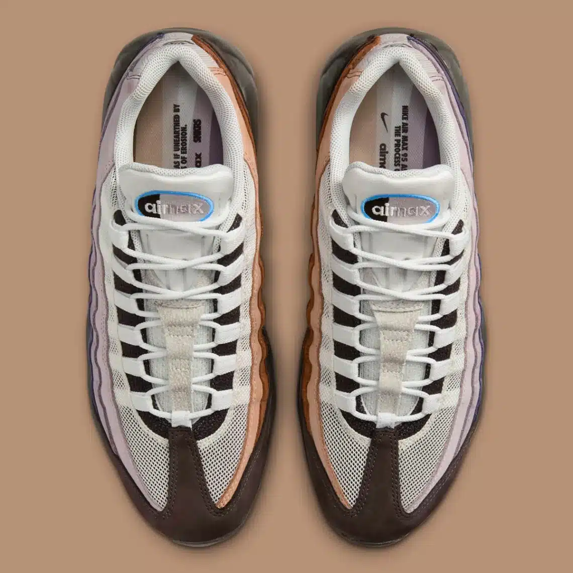 Het ontwerp van de Air Max 95 ‘Erosion’ speelt op ingenieuze wijze met texturen en contrasten. De kleuren variëren van diepe paarse tinten en aardse bruinen tot frisse blauwe accenten, waardoor het verhaal van erosie op een visueel aantrekkelijke manier wordt verteld.