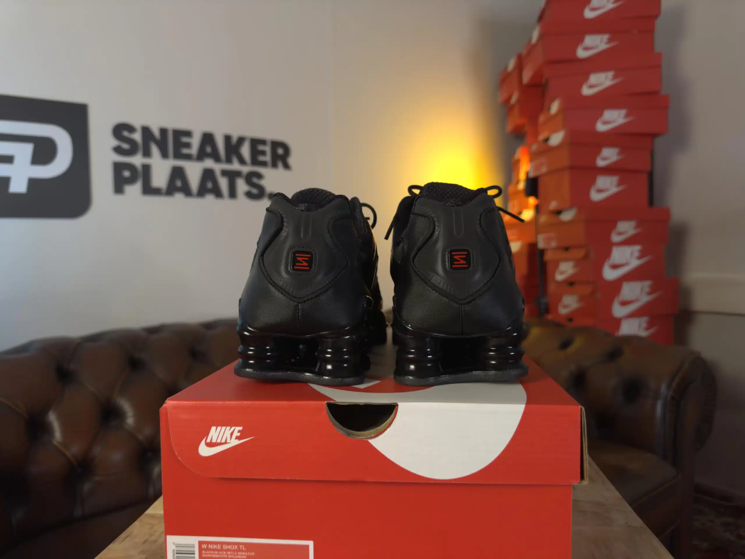 Laten we beginnen met het uiterlijk, want daar draait het bij de Nike Shox TL grotendeels om. Dit model is een visueel statement. De Black-on-Black colorway die we hier hebben, straalt een futuristische en agressieve look uit. Nike heeft gekozen voor een combinatie van glanzende en matte materialen, waardoor er een subtiele textuur ontstaat die de sneaker extra diepte geeft.